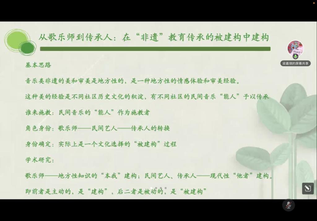 梁嘉琪同学以“音乐非物质文化遗产的传承与教育”为题,从从歌乐师到传承人:在“非遗”教育传承的被建构中建构、学术界对“民间艺人”的表述——一种技艺的学术观照两个角度出发,并结合现实实际以讲故事的形式进行分享,第一个故事为石阡花桥理发师兼县民族中学的仡佬族民歌传承教师毛呈祥的故事,第二个故事为双江山歌传承人吴乐华老人的故事。她认为同学们要以“歌乐师”、“民间艺人”、“传承人”等角色身份作为施教者进行课堂教学。