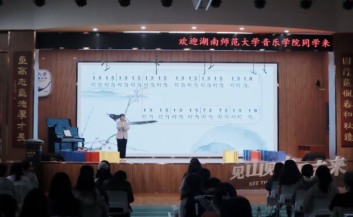 此次活动分为三个环节:第一环节为八分钟微型课展示,第二环节为示范课展示,第三环节为专家讲座。在第一环节中大四学生方玉泉、周丹凤就湘艺版五年级音乐课内容《在葡萄架下》、《踏雪寻梅》进行展示,微型课堂旨在让学生充分了解微型课的课程设计、语言表达、逻辑思维、专业能力、时间把握等,为能够成为合格的音乐教师打下坚实的基础。第二环节由熊淋老师带来示范课《唱支最美的歌》,她以三度构唱的和声练习作为课堂导入,鼓励学生在台上自主思考、自信演唱。在合唱部分的学习中,熊老师搭建四个楼梯,由简入繁地进行练习,同时配合画旋律线、柯尔文手势,使学生更好地掌握双声部的演唱;并带领学生探索音乐记号带给乐句的细腻情感,向守护国家和平、保卫人民安宁的军人致敬。第三环节,黎薇老师对当代中小学音乐老师发展进行指导规划,从多个角度剖析如何扬长补短的高效发挥自己的优点、如何提高教学水平和质量以及如何提升音乐老师的综合素质能力,并引导同学们做好以下三个方面的准备,一是用学生听得懂的语言讲音乐,二是关联教学彰显教者储备能力,三是结构化思维逻辑清晰的重要性。同学们都深表赞同,并牢记于心。