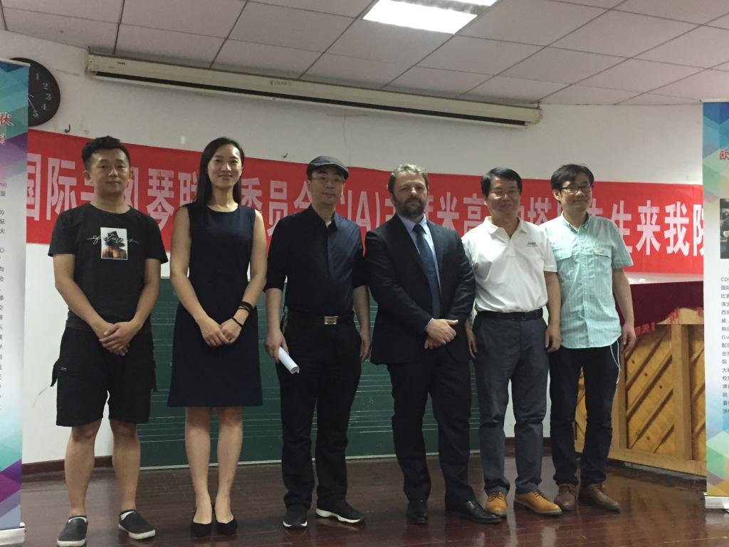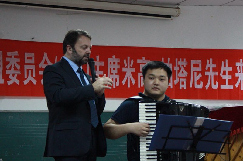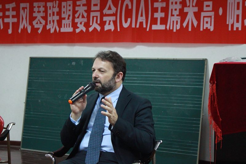 在为时两个小时的讲座中,米高·帕塔里尼先生为在场师生介绍了当前国际手风琴联盟的发展情况、并以意大利手风琴为例介绍了当今欧洲手风琴发展现状;并为研二在读手风琴专业硕士生余海龙演奏的《复调》进行了现场指导和大师教学。