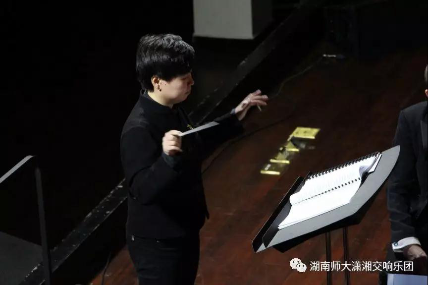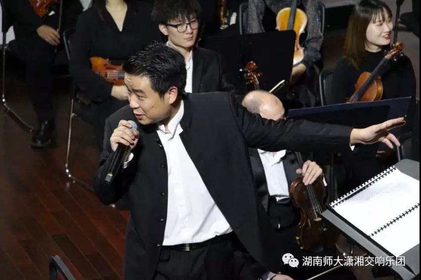 中场休息时,乐团指挥周小诗就乐团乐器一一进行介绍,十分幽默的为湖大师生讲解各个声部独特的音色展示,各个乐器用最耳熟能详的音乐让观众们了解不同乐器的音色特点,期间周小诗指挥生动有趣的讲解,丰富幽默的段子使本该难懂的一些专业术语变得通俗易懂,观众热情不减。