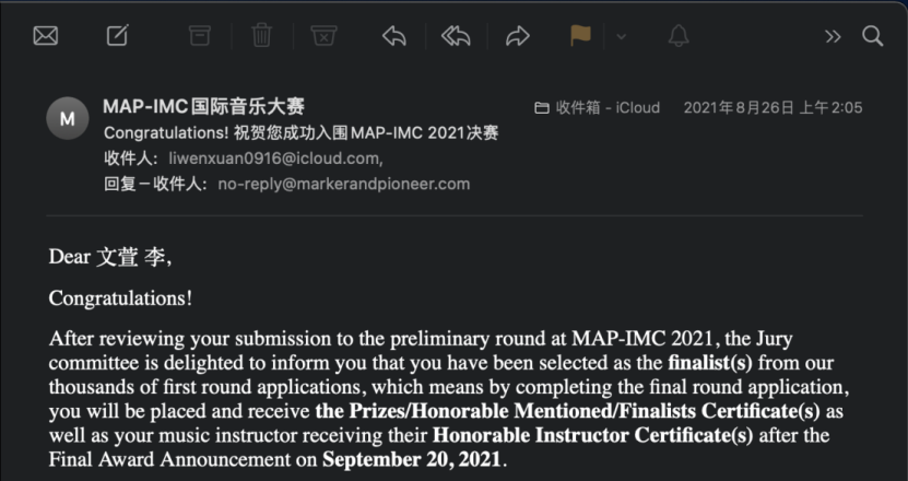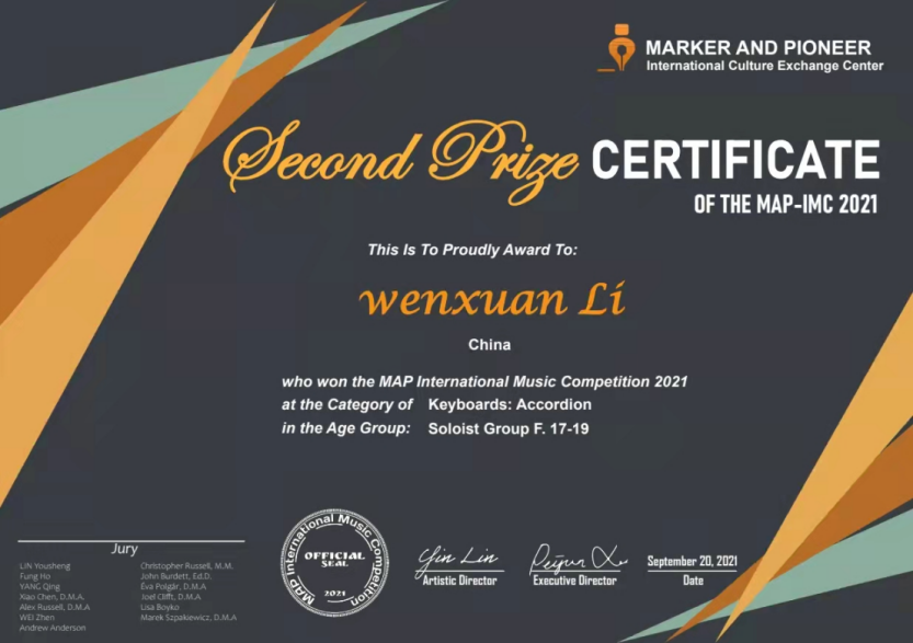 MAP国际音乐大赛在美国加利福尼亚洲的洛杉矶主办,是面向世界各地音乐家的在线国际音乐比赛。大赛分为键盘、弦乐、管乐、声乐和室内乐等类别。本次比赛分为初赛与决赛,共有来自世界各地的1100位参赛选手参赛。李文萱同学从千余人中脱颖而出,获得了二等奖的好成绩。比赛中李文萱同学演奏了两首作品:评审团专家称李文萱同学所提交的的作品是精彩绝伦的表演,夸奖他的演奏具有非常强的表现力,充满力量与热情,称其音乐性具有非常大的说服力。
