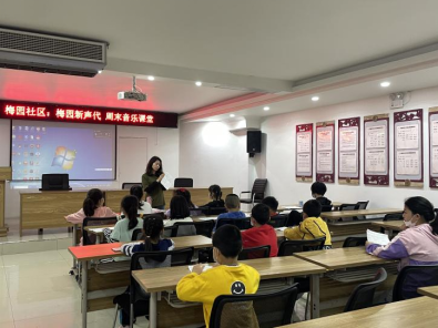 伴随着清晨微风,志愿者于岳麓区梅园社区居民活动中心开启了本周的音乐课堂。课程共分为一节歌曲学唱课和一节艺术鉴赏课。第一节课,志愿者首先带领孩子们温习了歌曲《祖国的花朵》,随后完成了歌曲剩余部分教学,并结合歌词带领孩子们进行了动作编创,孩子们热情参与,并在志愿者的鼓励下纷纷上台进行自我展示,整个课堂学习氛围浓厚,学习效率较高。第二节课,志愿者向孩子们依次介绍了不同种类的艺术舞蹈作品,此外,志愿者还开展了音乐节奏规律模仿、音乐模唱等娱乐小游戏,让孩子们更好的体会音乐的各种知识,感受音乐的无穷魅力。
