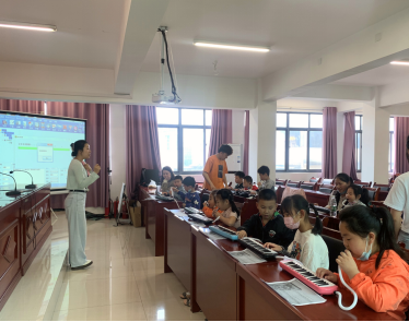 志愿者教孩子们吹奏口风琴