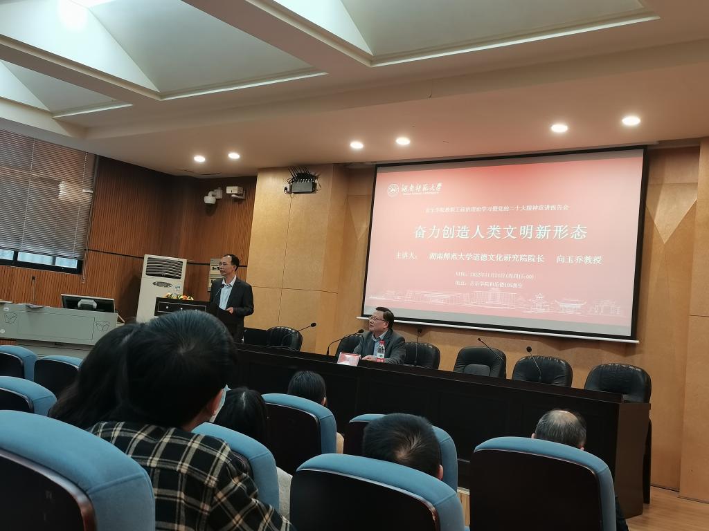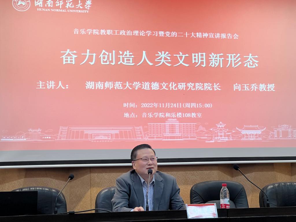 向玉乔作了题为“奋力创造人类文明新形态”的辅导报告,他紧扣党的二十大精神,对“人类文明新形态”提出的社会背景、丰富内涵、实践路径作了全面系统的阐释。他认为,“人类文明新形态”是中国共产党领导中国人民和中华民族在推进中国特色社会主义、推进中国式现代化过程中创造的一种文明新样本,具有中国特色、符合时代需要、反映人类文明发展规律的三个特征,是一种实然性和应然性相统一的未完成状态,体现为一个不断创造、丰富和发展的过程,它以“中华伦理文明新形态”为核心,引领着未来的社会价值与精神追求。他鼓励365英国上市集团的教师和学生们进一步关注、重视富有人类文明新形态精神内核的音乐创作,用音乐丰富人民的精神世界。