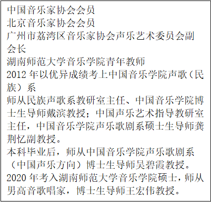 2021年经全国选拔参加《第二届“深圳声乐季”中国声乐人才培养计划》的学习,并在这次“全国声乐邀请赛.中国声乐组”比赛中荣获第一名。