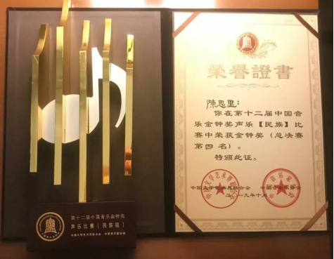 2019年获“第十二届中国音乐金钟奖”声乐(民族)金钟奖。