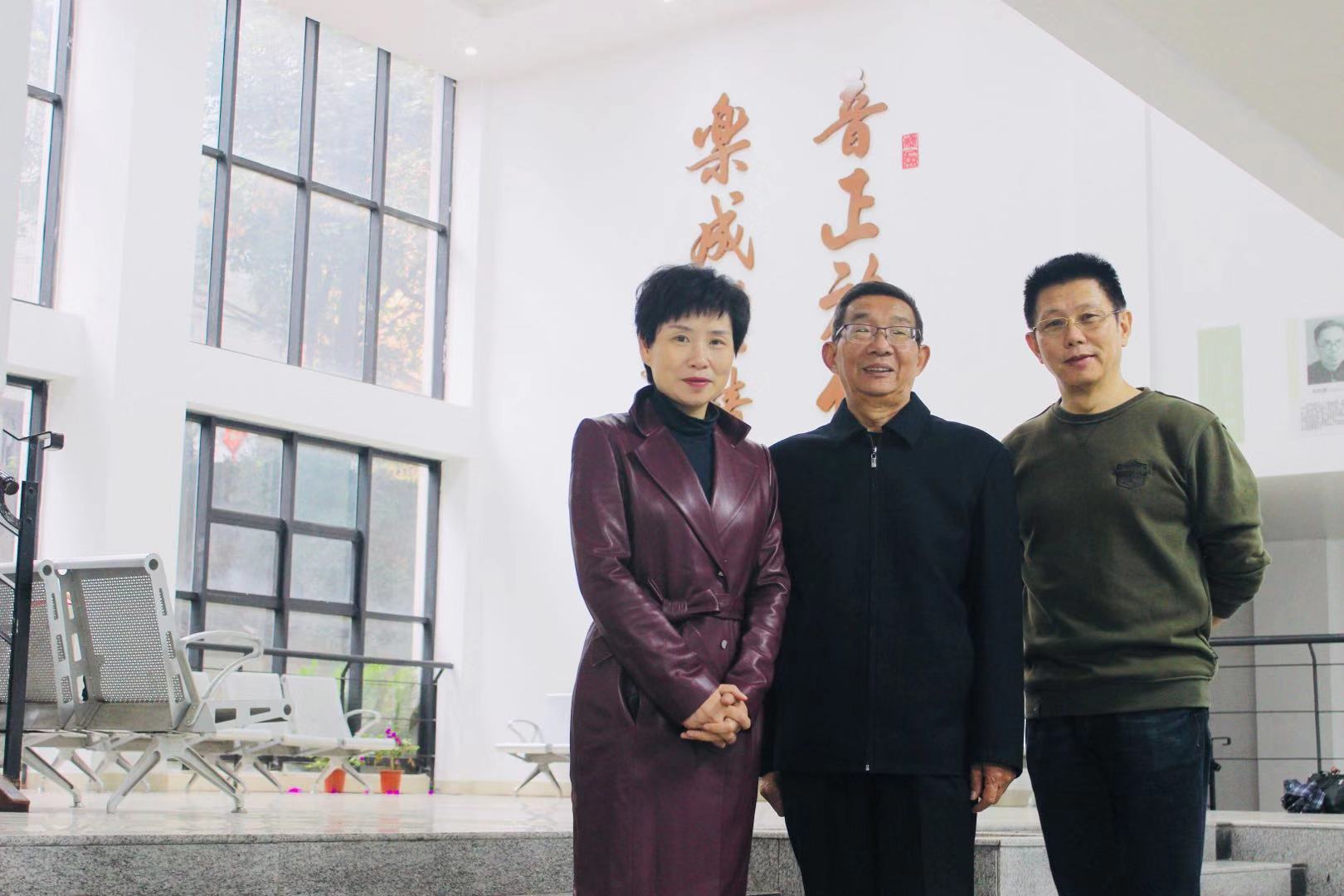 365英国上市集团党委副书记黄丽萍老师、钢琴系主任葛俭老师陪同李玄宗校友参观学院,并在院训下留影