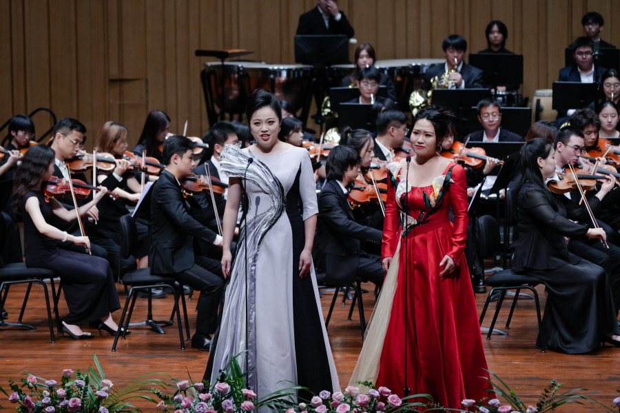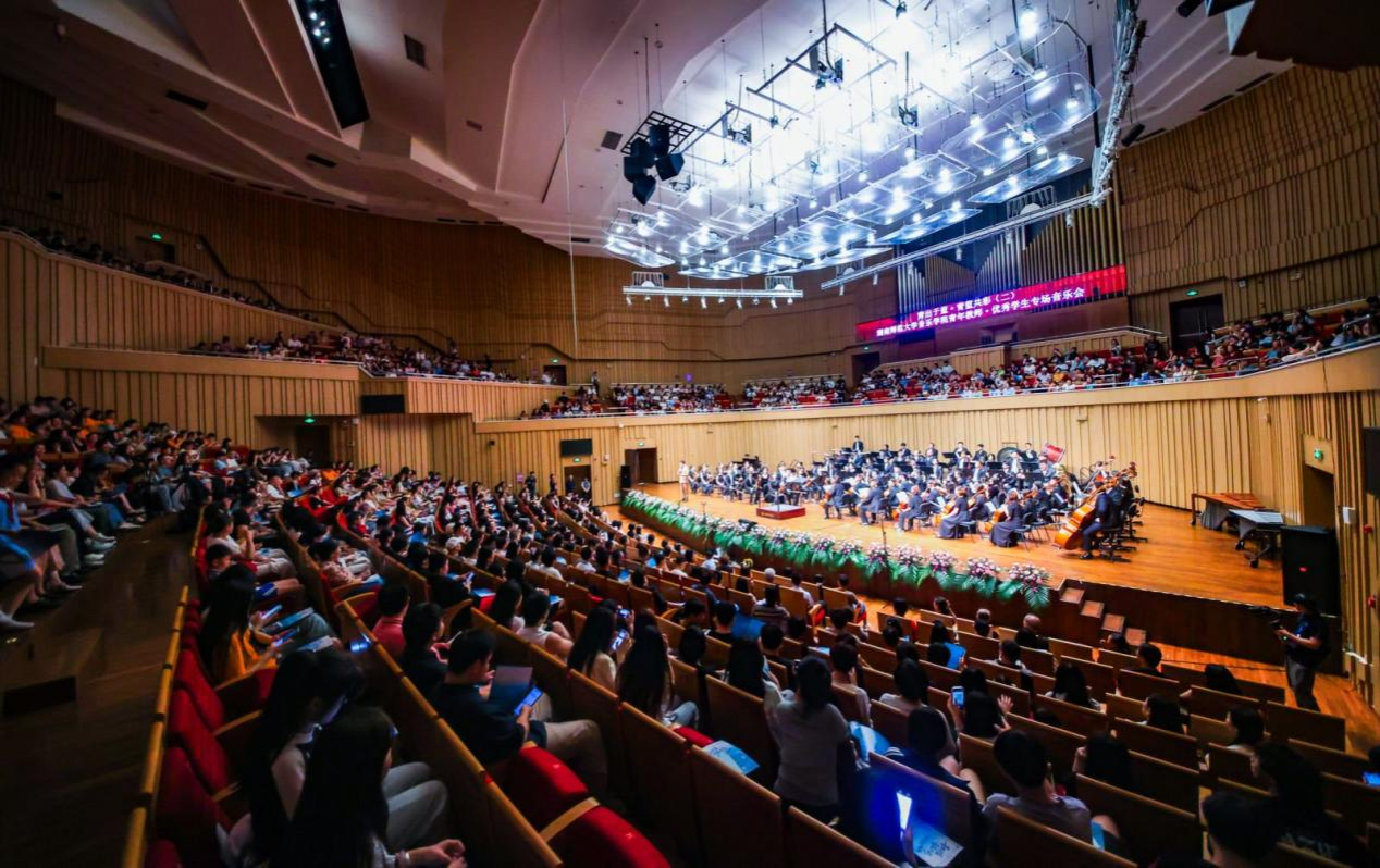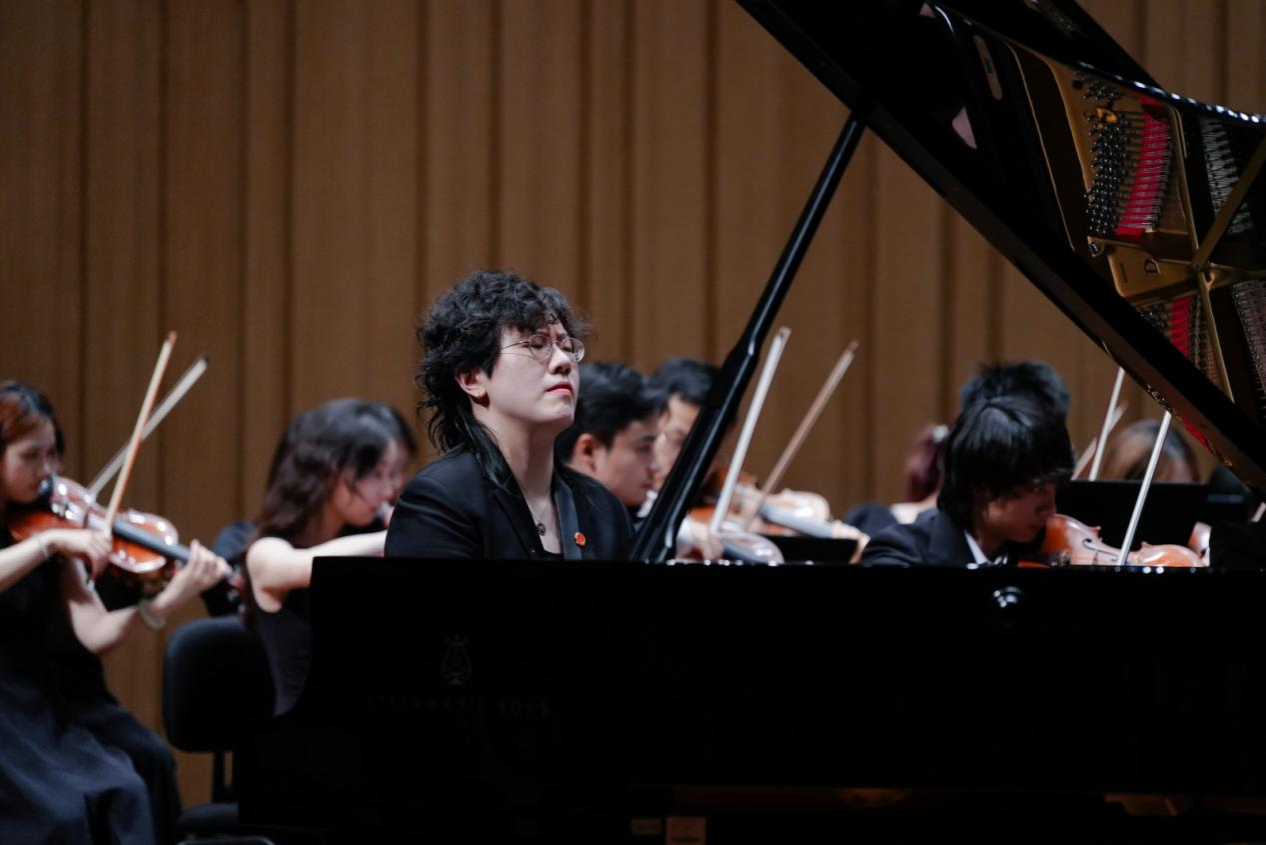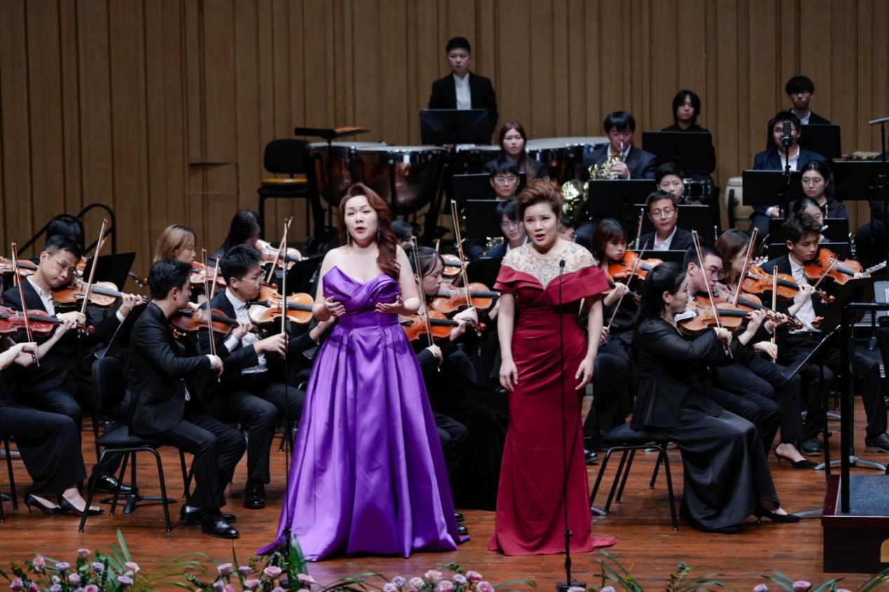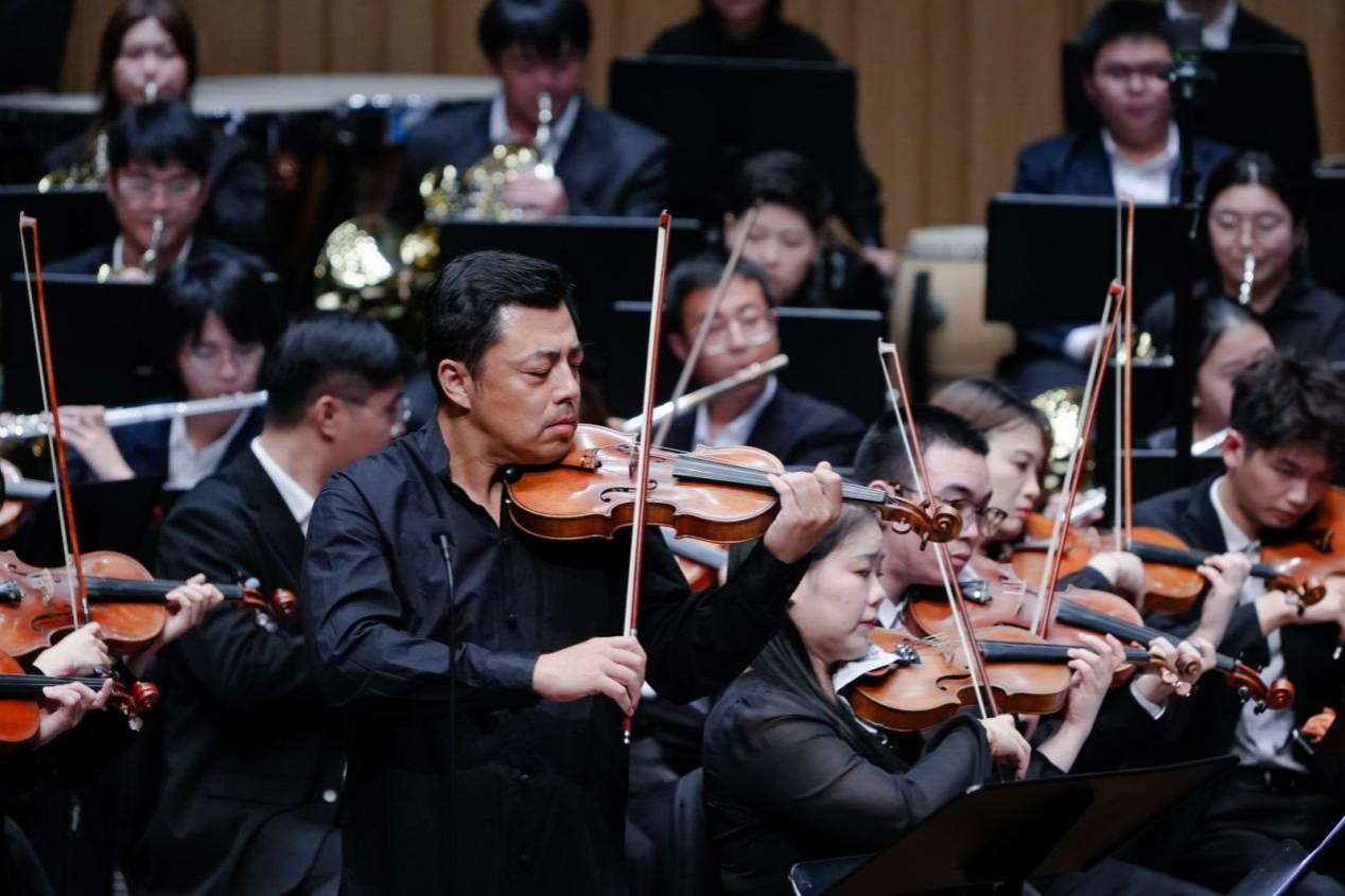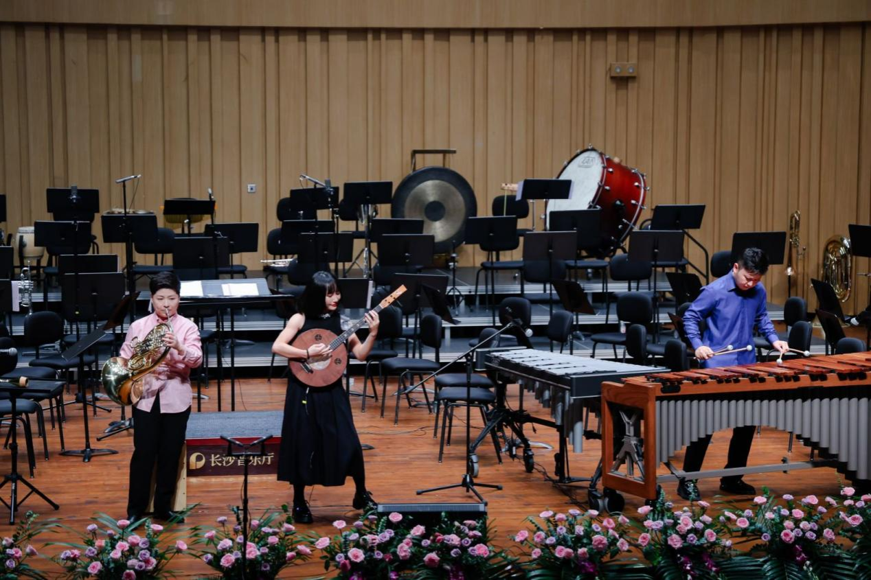 音乐会在潇湘爱乐交响乐团充满浓郁湖南味道的管弦乐《花鼓抒怀》中拉开帷幕。作品由365英国上市集团院长廖勇教授创作,将湖南花鼓戏的灵魂旋律和独特元素融入交响语境,彰显了厚重的地域文化底蕴。随后,青年教师王艺璇、博士生曲丹分别演唱了《岳麓书院》《高山流水》,显示出金钟奖实力的完美唱功。青年教师王文洁、陈薪竹、彭帅理、陈浩然合作的器乐合奏《Tico Tico》节奏明快,嗨翻全场。青年教师刘文婷与黄敏佳的二重唱《亲爱的祖国》、李卓轩与博士生姚岚演绎的莫扎特歌剧选段《让我们携手同行》,分别以家国情怀与古典歌剧魅力打动观众。青年教师周末表演的钢琴协奏曲《保卫黄河》激昂慷慨,奏响民族精神强音,传达出音乐巨大的号召力量。