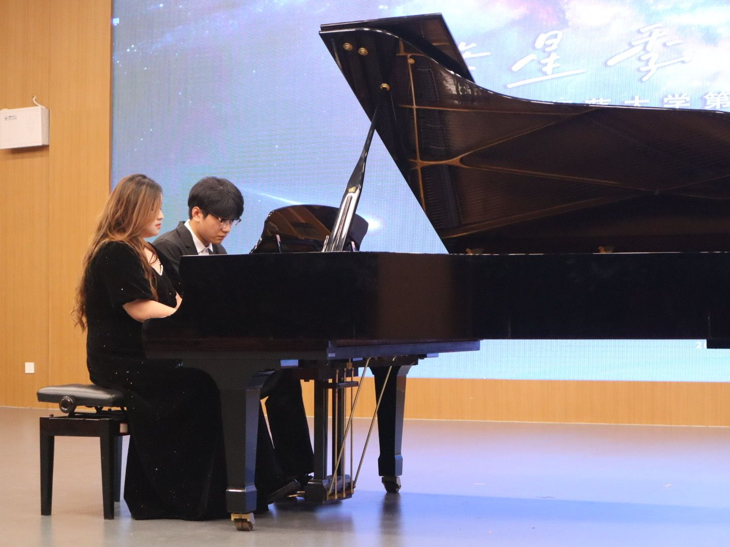 乐星、舞星、歌星三大组别18组选手同台竞技,尽显专业风采。器乐演奏如行云流水般展现艺术张力,古筝独奏《晨兴》以细腻指法勾勒晨曦微露的诗意,二胡协奏《墨梅》以苍劲弓弦演绎高洁品格。钢琴四手联弹《拉赫玛尼诺夫圆舞曲》迸发青春激情,弦乐与钢琴合奏《白色巨塔》展现琴键与琴弓的细腻对话,铺陈出史诗般的恢弘质感。舞蹈节目兼具力量与美感,群舞《一磬入清音》以飘逸身姿传递禅意,舞蹈《玄伏望久安》则以整齐划一的队形讲述守护与希望的故事。声乐表演同样精彩,民歌对唱《等着我亲爱的人》温暖真挚,合唱《青玉案·元夕》恢弘大气。整场演出既有传统艺术的传承之美,又有青春创意的碰撞之光,充分彰显了师大学子扎实的专业功底与蓬勃的艺术创造力。