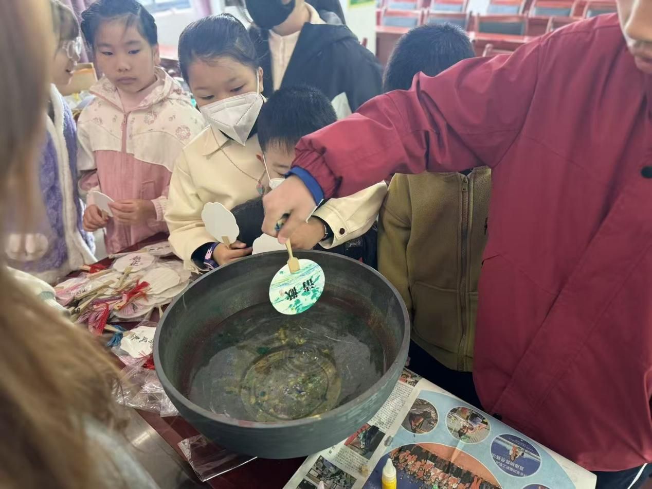 活动伊始,志愿者用有趣的故事讲解了漆扇的历史渊源,让孩子们了解了大漆的天然属性,传授了水面漂漆、扇面沉浸等核心技法及多种入水摆动技巧,并指导孩子们完成配色选择、漆料调配等步骤,让每一把漆扇都成为孩子们自由发挥的专属艺术品。此外,孩子们还在志愿者的指导下协作完成了手工风铃制作。志愿者指导孩子们用塑料杯、铃铛和细绳制作风铃,部分孩子还在风铃上作画创作。