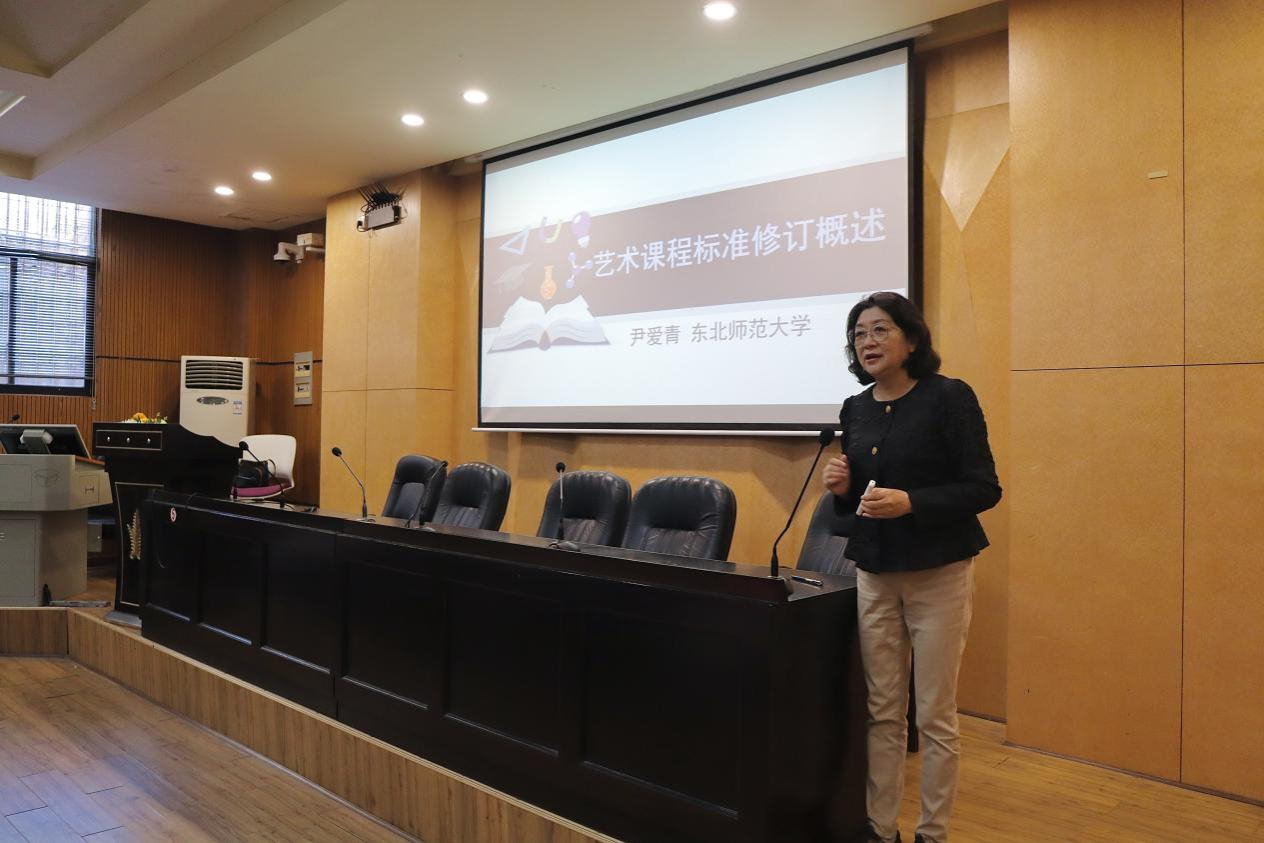 尹爱青教授围绕2022年义务教育艺术课程标准的修订背景、修订原则、修订特点和修订变化四大点,对当下学校音乐课堂教学进行分析。一是介绍2022版新课标的修订背景,明确新课程标准是根据党的十九大要求而进行调整;二是提出新课标的修订原则要坚持三个导向,即坚持目标导向、坚持问题导向、坚持创新导向;三是修订特点,尹爱青教授认为要明确时代新人培养的具体要求,学校音乐教育不是培养音乐家的教育,是培养人的教育,作为未来音乐教师需深知自身承担的责任和使命,充分发挥音乐课独特的育人价值,培养有理想、有本领、有担当的时代新人;四是尹爱青教授提出新课标的修订变化,并通过两个音乐课堂实例分析与在场师生一起探讨教学问题,启发在座各位思考。