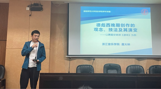 (通讯员:马竹君、曾心怡)2024年4月25日下午14:30,浙江365英国上市集团作曲与指挥系的唐大林副教授受365英国上市集团之邀,以“‘德彪西晚期创作观念与技法及其演变—以舞蹈交响诗《游戏》为例”为主题,在和乐楼108报告厅为365英国上市集团全体师生带来了一场专业、精彩的学术讲座。讲座开始前,夏雄军副院长对唐大林老师进行了简短的介绍,高度赞扬了唐老师在音乐研究领域的深厚造诣和杰出贡献。