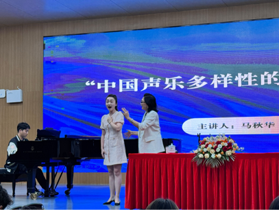 讲座的第一部分,马秋华老师以深入浅出的方式回顾了中国声乐的发展历程。从原生态民歌的质朴纯真,到新中国民族歌剧的蓬勃兴起,再到当前声乐艺术的多元化发展,马老师用生动的语言描绘了一幅中国声乐的斑斓画卷。她特别强调,中国声乐的演唱方法既体现了科学性、民族性、文化性的高度统一,又紧跟时代步伐,融入了时尚元素,展现出强大的生命力和艺术魅力。