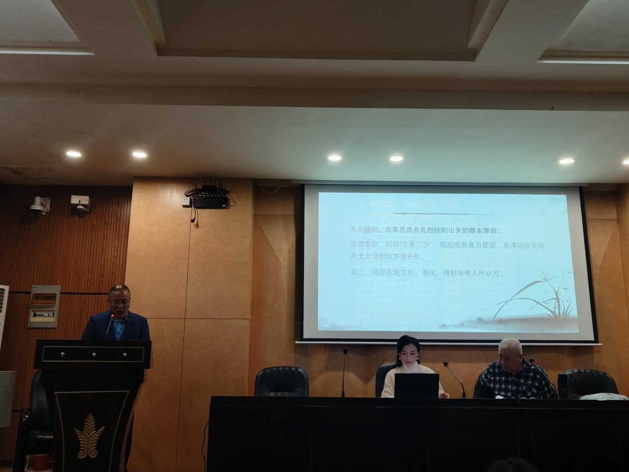 讲座中,唐湘音老师从“昆曲概况”“湘昆起源”“昆山彩凤腾飞南国”等七个方面详细讲述了湘昆的起源和发展历程。并且详细为大家解答了“湘昆何以在偏僻的桂阳薪火相传数百年?”“湘昆最早的戏班是哪里来的?”“何以清代十多个昆曲班社都在桂阳北乡的莲塘周围产生?”“湘昆为何能深深扎根桂阳民众生活?”的问题。对于“湘昆起源”,唐湘音老师从数个方面进行研究,最后得出结论:1643年 ,兵祸使藩王府昆班落脚桂阳山乡。在关于昆曲扎根桂阳山相的根本原因,唐湘音老师指出:“适者生存,剧目三多三少,唱腔改吴音为楚语,表演吸收当地风土人情和地方戏长处。总之,是昆曲地方化,湘化,得到当地人民认可”。