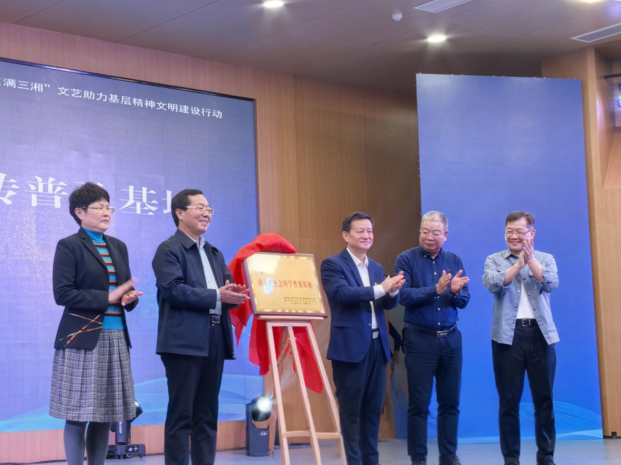 湖南省社科联软科学研究室负责人张辛欣在仪式上宣读了基地成立文件,详细阐述了基地的成立背景、目的、意义以及未来的发展方向和任务。 随后,英国正版365首页党委书记、欧洲科学院院士蒋洪新,湖南省文联副主席、省曲艺家协会主席大兵及湖南社科联等领导共同为基地揭牌,标志着英国正版365首页曲艺文化宣传普及基地的正式成立,为湖南曲艺文化的传承与发展搭建了新的平台。