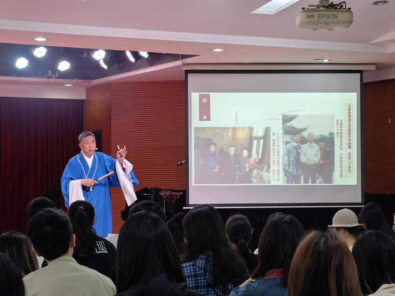张富光先生还通过实物展示,生动阐释了昆曲的文化象征。他手持明代文人折扇与清代长衫,对比了明清两代读书人服饰变迁背后的文化意蕴:“明代折扇象征文人风骨,清代长衫则承载了汉文化在满清统治下的坚守。”现场师生直观感受到昆曲艺术“以形载道”的文化特质。
